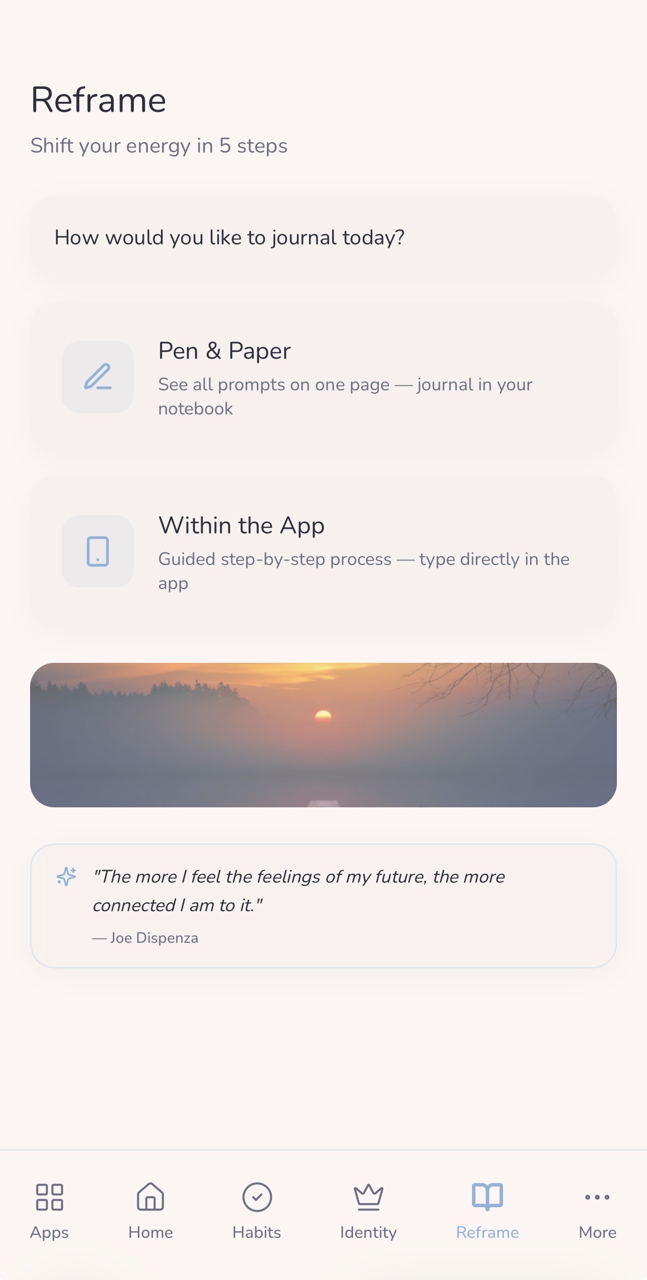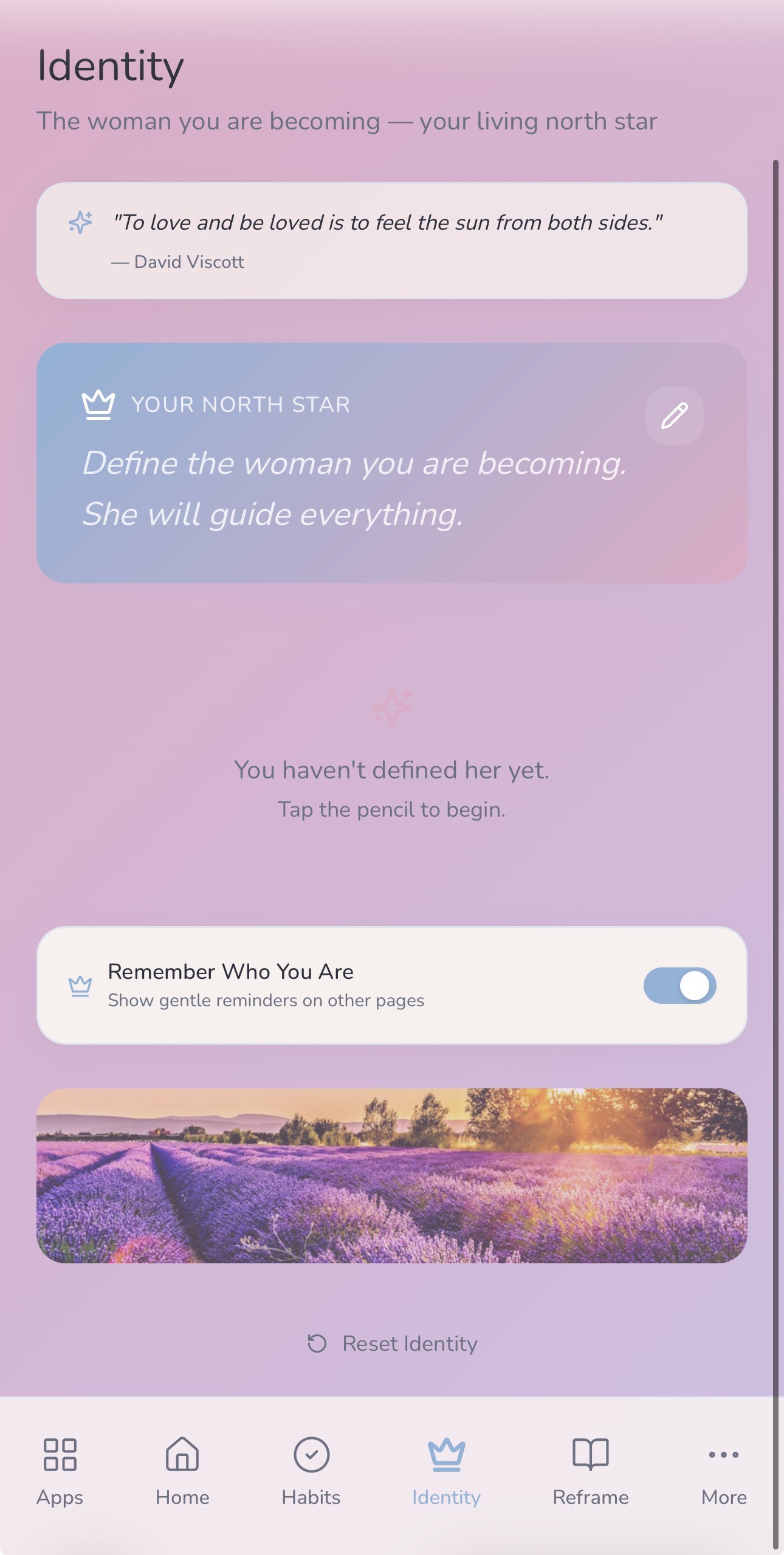 A personal wellness app that guides you back to your highest self through habit tracking, identity work, guided reframing, and AI-powered emotional coaching.