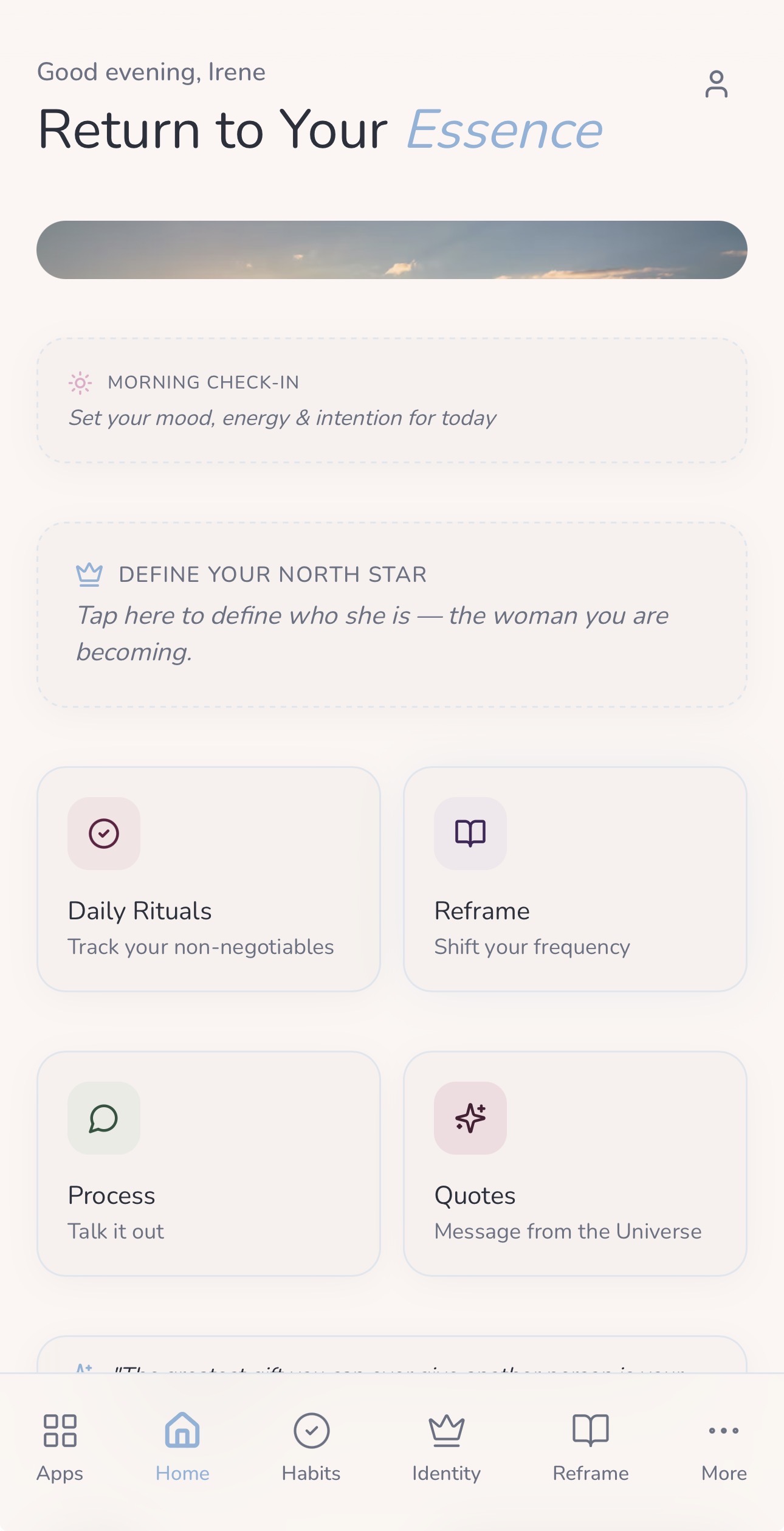Essence by Irene is a self-care sanctuary built for women who take their inner world seriously. The app combines daily and weekly habit tracking with personalised reminders rooted in your why, a guided 5-step reframing journey to shift energy and perspective, an AI coaching chat that asks powerful questions, an identity profile that evolves over time and influences the entire app experience, a curated quotes library, and Elevate, a living desire list of things that enrich your life and help you step into your highest self. Built entirely in one day with no prior coding experience.
